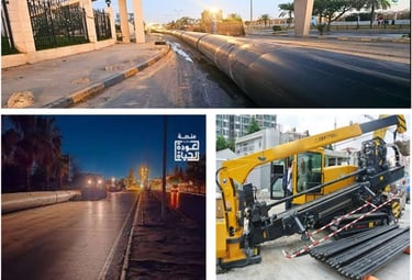 Études et conceptions du projet de remplacement des réseaux d'assainissement et d'évacuation des eaux pluviales le long de la route de l'université à Tripoli, utilisant la technique de forage horizontal dirigé (HDD), avec un diamètre de forage de 1800 mm et un diamètre de conduites de 1200 mm.